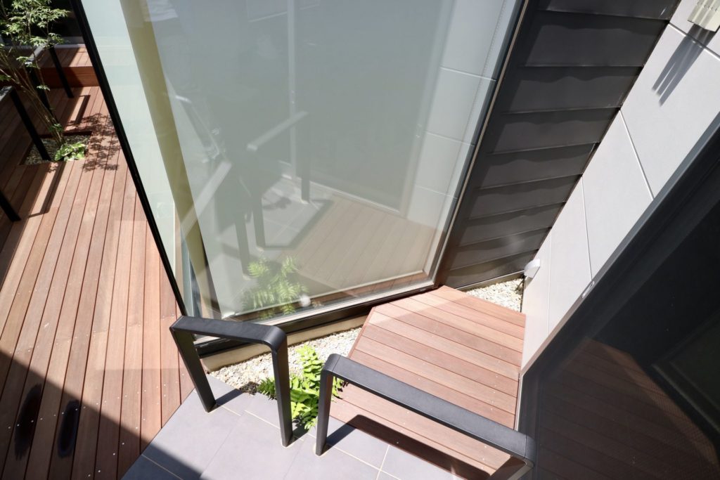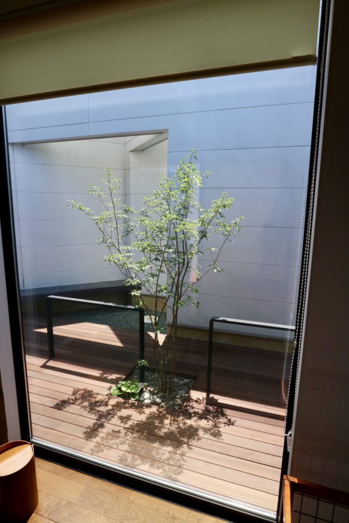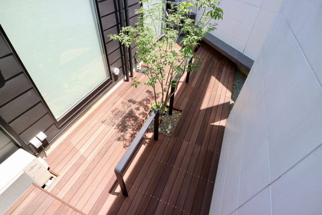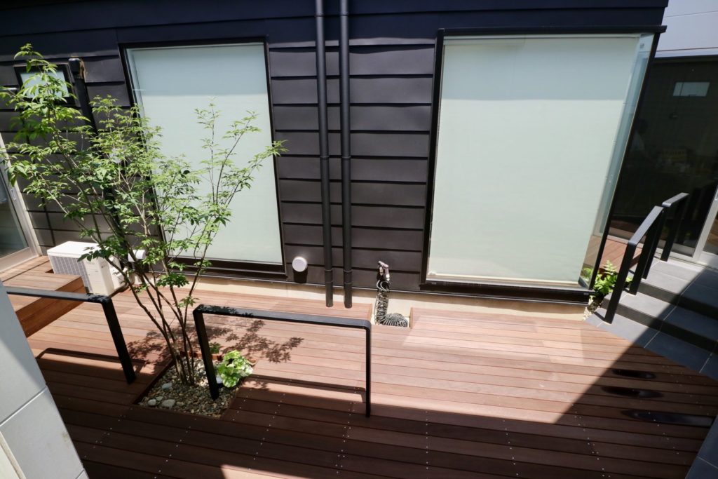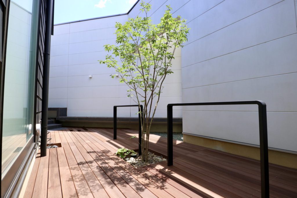 元々がお部屋との一体感を重視した中庭でしたので、デッキ床を少し高くする事でよりそれを強く感じていただける様にできたと思います。