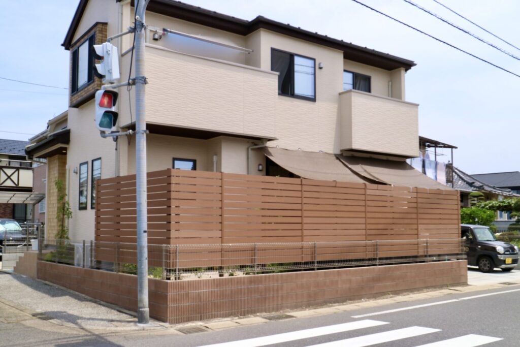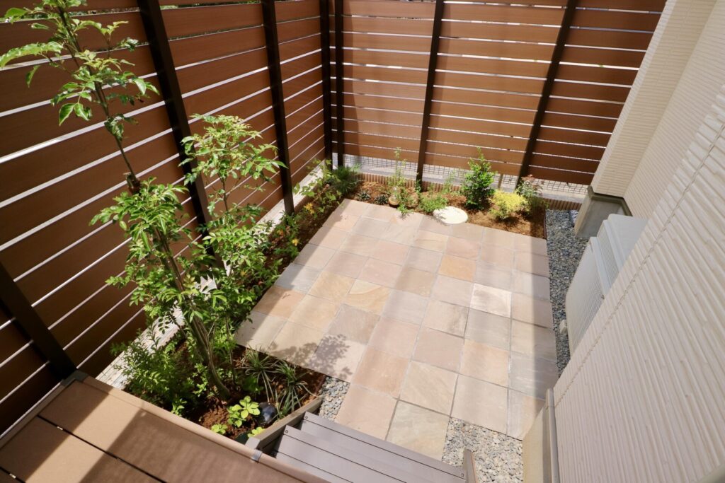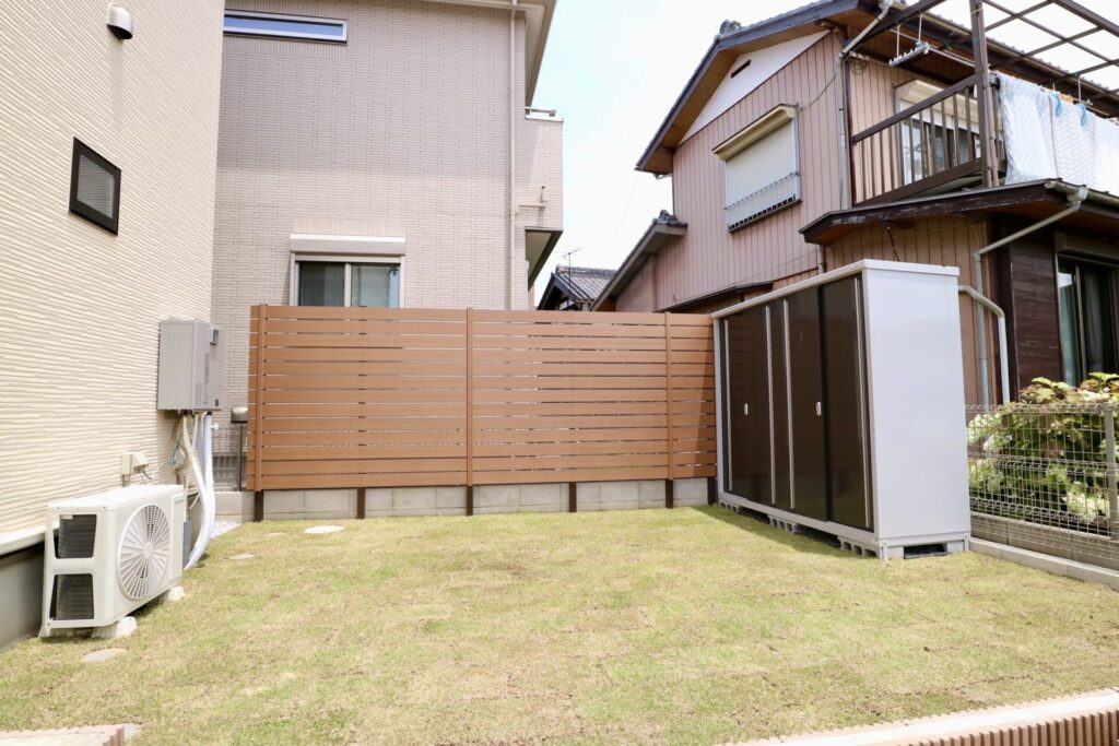 掃き出し窓から直接つながるメインのお庭は通行量の多い交差点に面した場所でしたので、ウッドフェンスでしっかりと囲いましたが閉塞感を軽減できるように横板に隙間をあえて設けましたが、信号待ちをしている車の運転手とお部屋からの視線がダイレクトにぶつかってしまうという事で、視線がぶつかり易いレベル箇所の隙間は塞ぐ形で収めました。