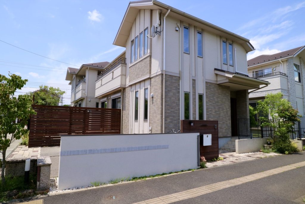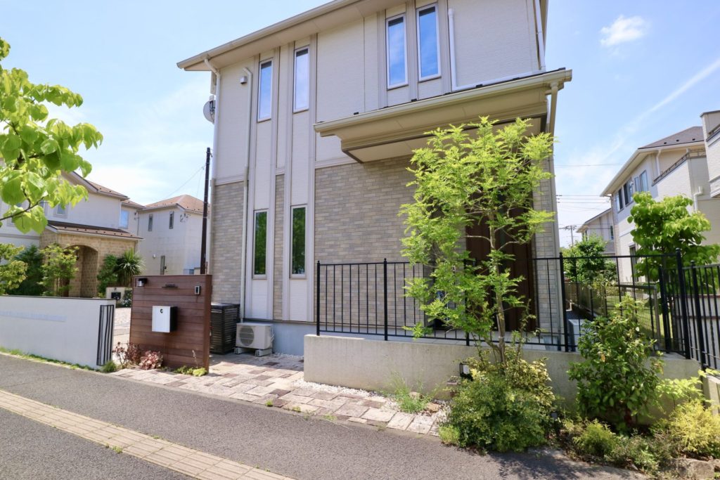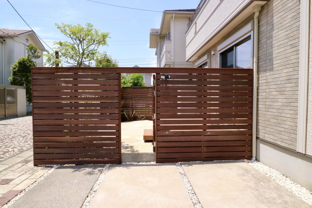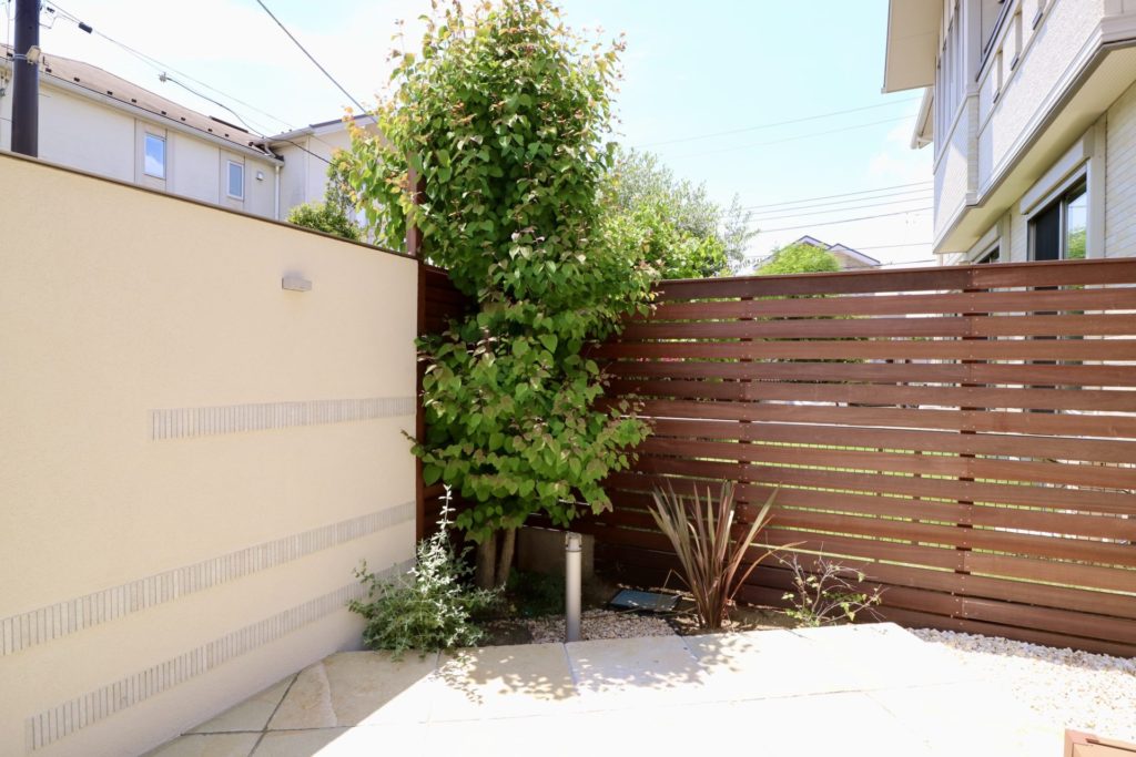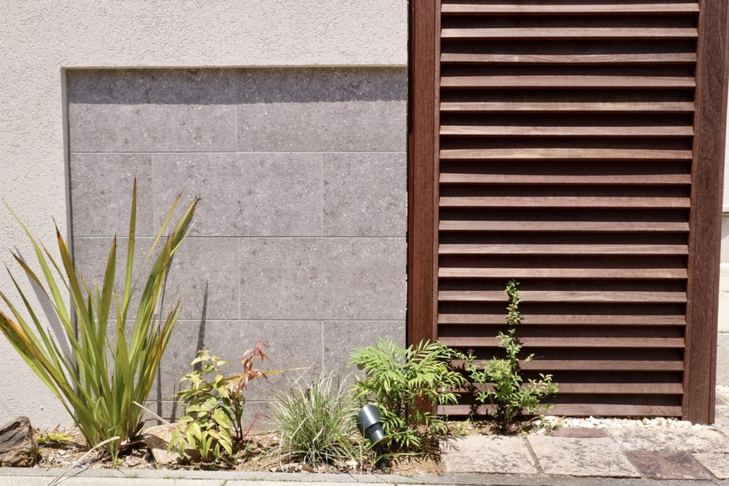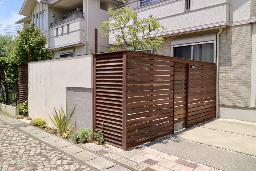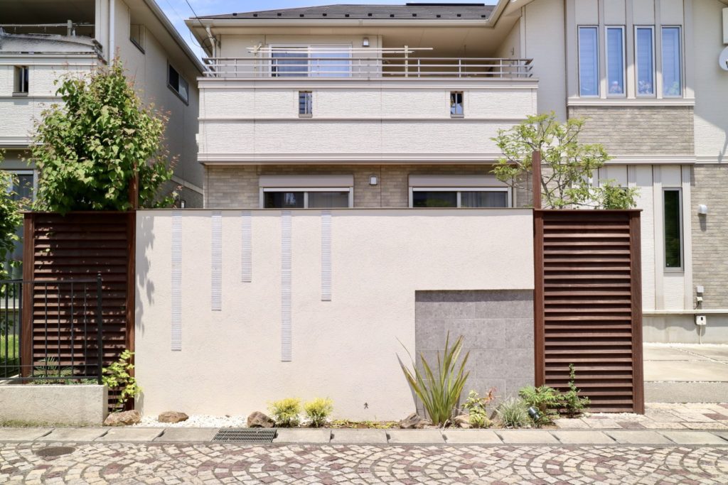 道路に対して側面になる部分には隙間のあるボーダーフェンスにして閉塞感の軽減と風通しを確保していますが、道路正面になる面には壁とルーバーフェンスを組み合わせてしっかりと視線を遮る形にしています。