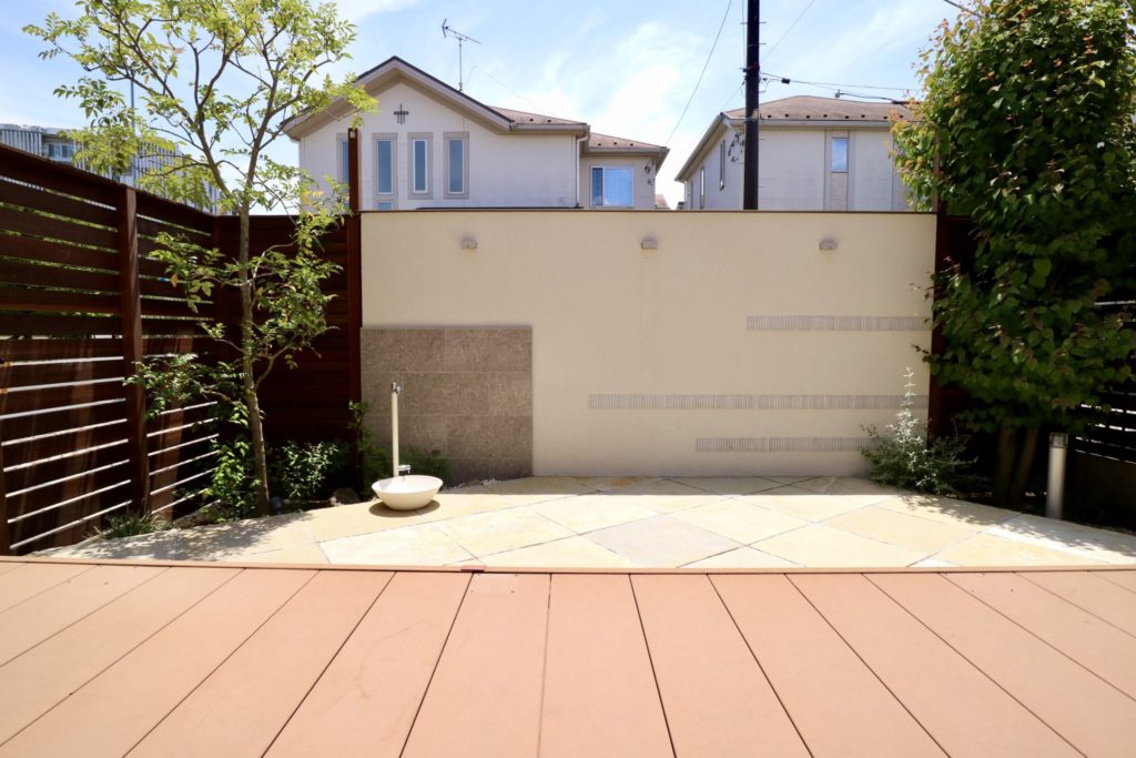 既存の植栽のボリュームを持て余してしまっている中で見栄え良くリフォームできないか、また、既設で広い樹脂木デッキがありながら角地が故にプライバシーの確保が難しい状態という事でご相談いただきました。